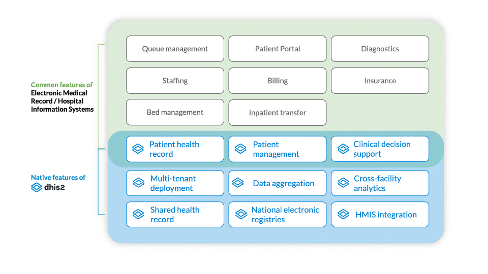 La plataforma DHIS2 incluye funciones integradas que cumplen los requisitos clave de los EMR, EHR y registros digitales de los establecimientos: