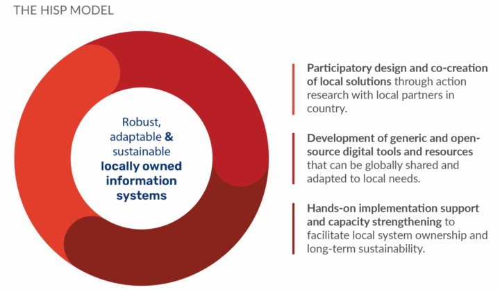 Nos stratégies pour réaliser cette vision ont évolué au fil du temps, car le HISP est passé d’un petit projet de recherche-action à un réseau mondial de 23 groupes locaux (et ce n’est pas fini) basés en Afrique, en Asie, au Moyen-Orient et en Amérique, et notre logiciel est passé d’un projet pilote en Afrique du Sud après l’apartheid à la plus grande plateforme de système d’information sur la gestion de la santé (SGIS) au monde, et à un exemple de premier plan de Bien public numérique (BPN).
