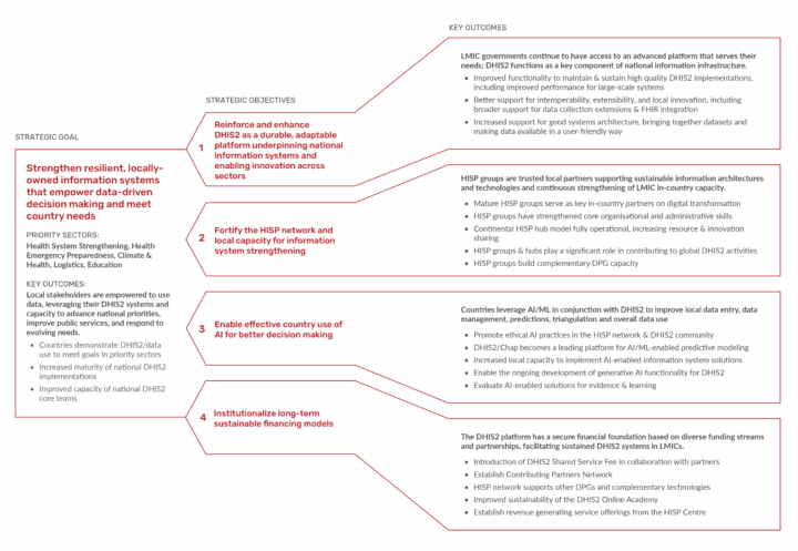 - Objectif stratégique 1 : Renforcer et améliorer le DHIS2 en tant que plateforme durable et adaptable sous-tendant les systèmes d’information nationaux et permettant l’innovation dans tous les secteurs.