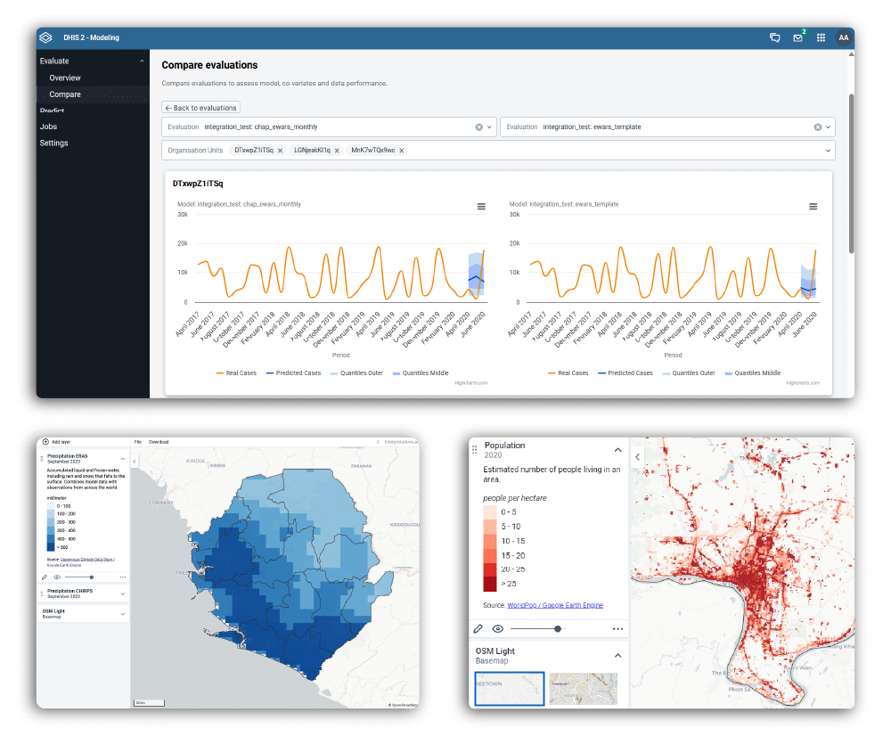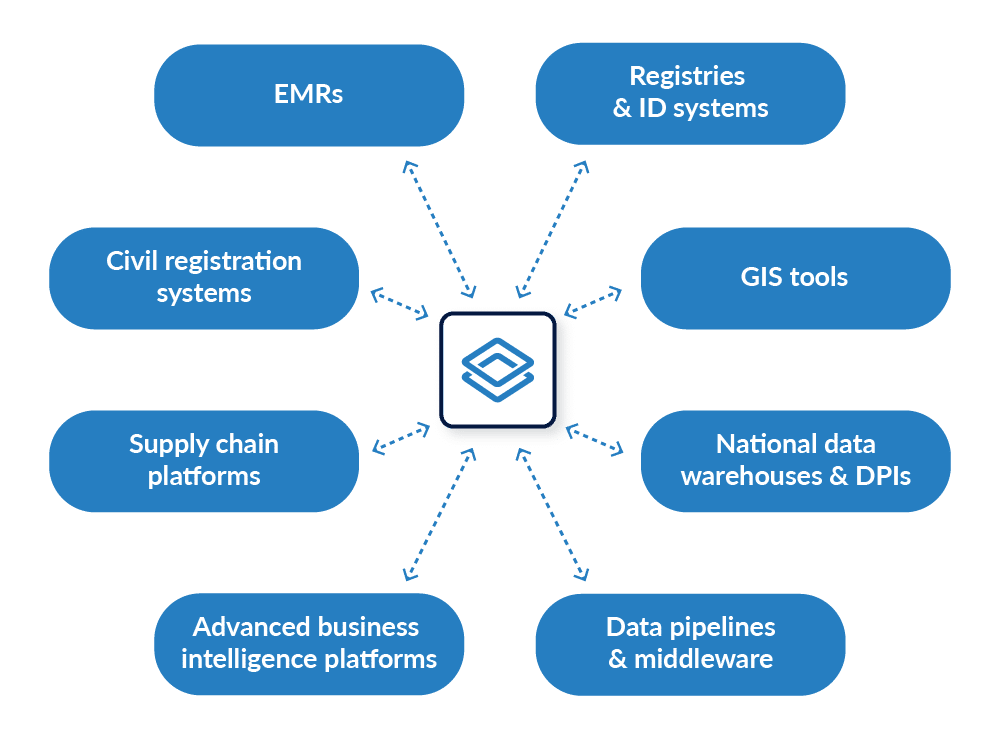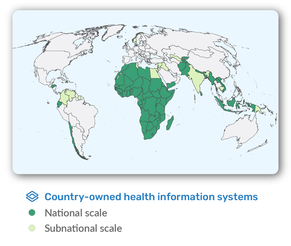 DHIS2 can serve as a key component of an integrated health intelligence architecture. More than 75 countries already use DHIS2 as their locally owned, national-scale platform for collecting and managing routine health data. In addition to the service delivery and population health from national Health Management Information Systems (HMIS), these national systems can also include granular disease surveillance data from Integrated Disease Surveillance and Response (IDSR) systems, real-time data from health campaign platforms, facility-level commodity and logistics data, and more. Thanks to DHIS2’s design as an open, interoperable platform, countries can leverage DHIS2 as the foundation of integrated health intelligence approaches that also include additional software platforms and data sources.