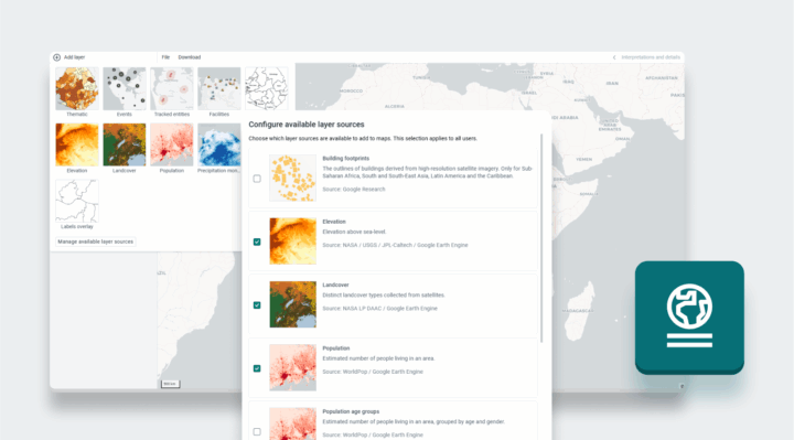 Os administradores com autoridade para gerir camadas externas podem agora selecionar camadas (por exemplo, do Earth Engine) do catálogo para serem visíveis ou ocultas a outros utilizadores da aplicação Mapas.